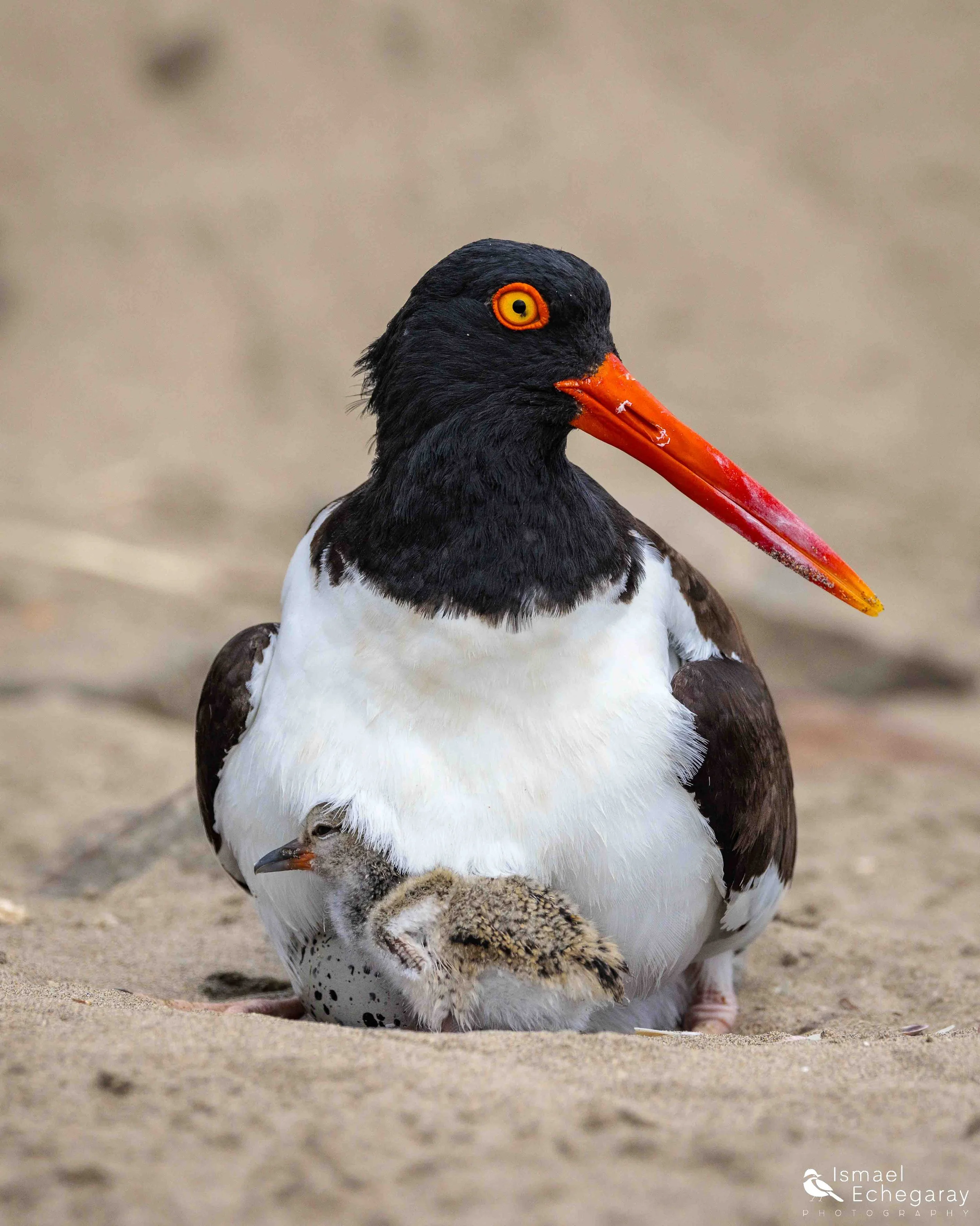 Un polluelo de Ostrero Américano esperando que el huevo que contiene a su hermano eclosione